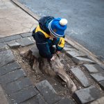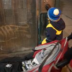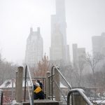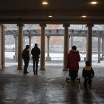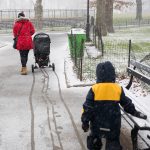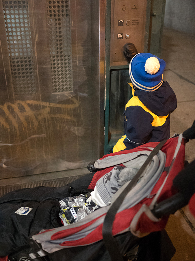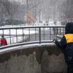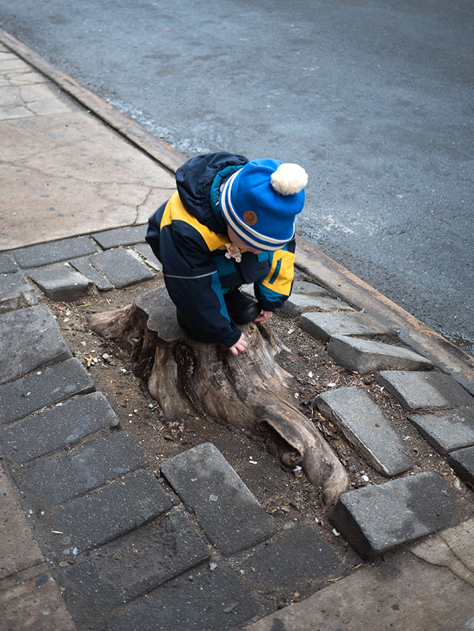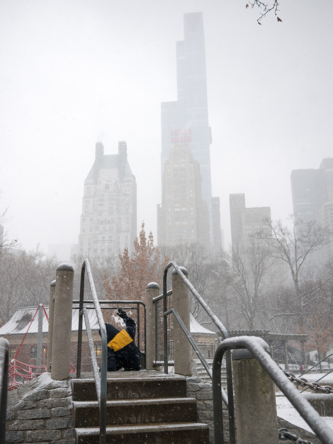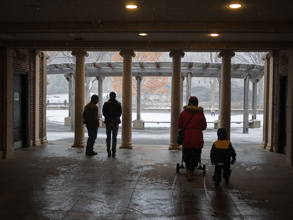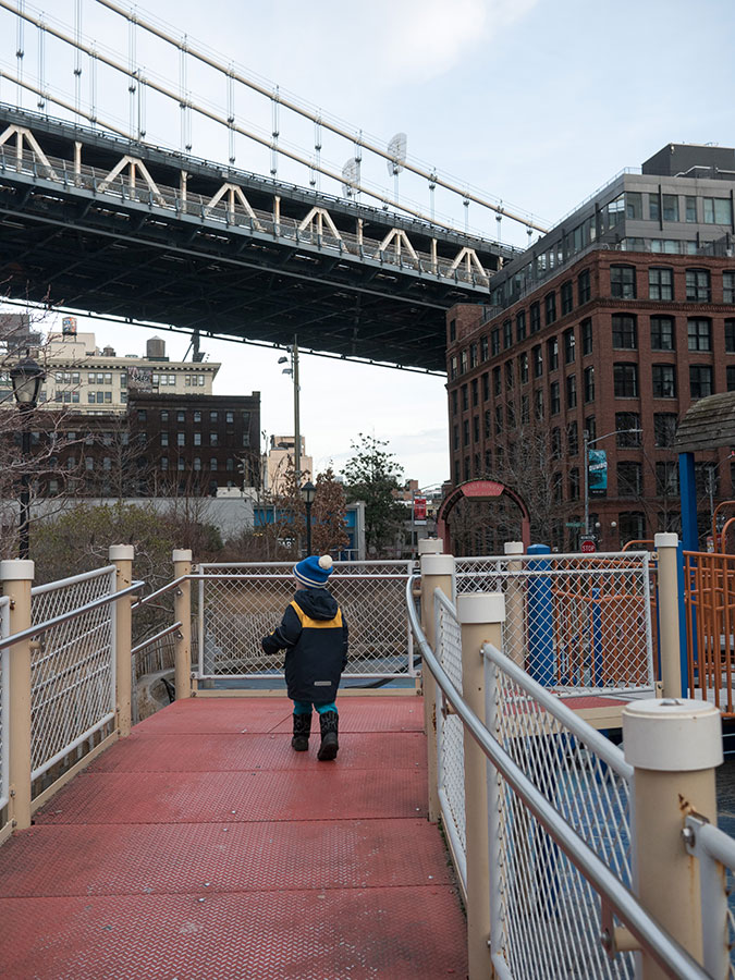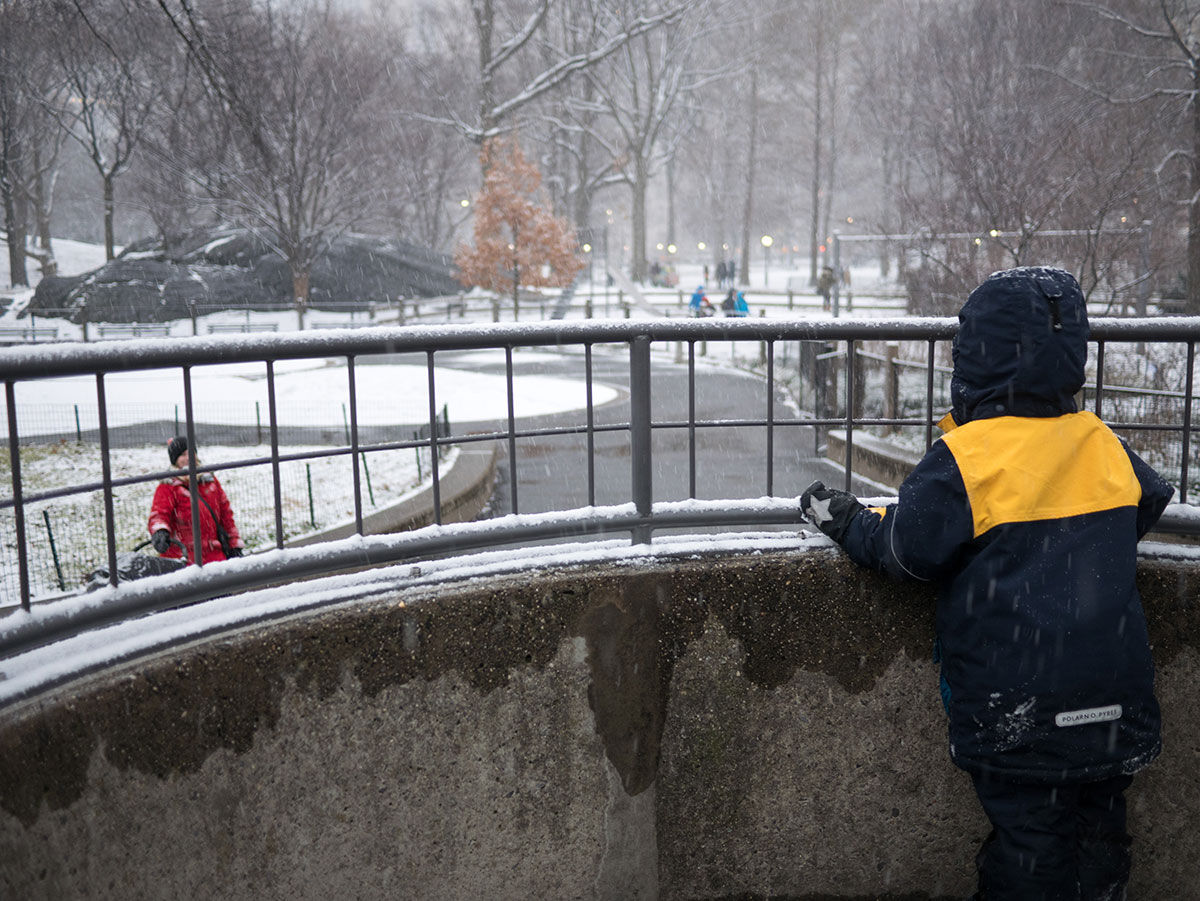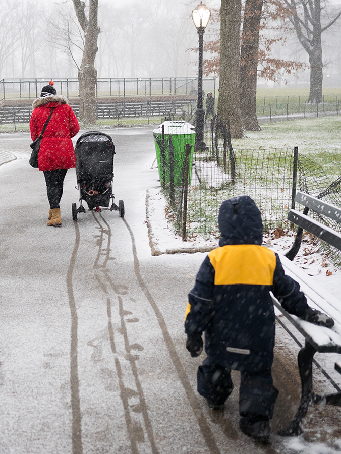 Huomasimme, että matkaväsymys oli iskemässä meihin. Olemmehan joka aamu pompanneet ylös ja pakanneet repun ja lähteneet tutkimaan kaupunkia ja palanneet kotiin vasta myöhään illalla. Lisäksi Vilperi on valvottanut meitä parina viime yönä, ja aamulla on ollut jyrän alle jäänyt olo. Niinpä otimme tämän aamun rauhallisesti emmekä tehneet yhtään mitään. Pääsimme lähtemään kotoa vasta vähän ennen kolmea ja suuntasimme keskuspuistoon. Taivaalta satoi märkää lunta, joka kasteli meidän kengät ja takit (paitsi Hemulin, jolla on vedenpitävät vermeet). Löysimme leikkipuiston keskuspuistosta ja parkkeerasimme sinne. On niin hauska seurata pientä lasta, joka ei jaksaisi millään kävellä metriäkään ja joka vaatii koko ajan päästä isin syliin, kunnes ollaan leikkipuiston portilla jonka jälkeen ei enää jalkoja väsytä yllättäen lainkaan. Niin kävi taas tälläkin kerralla.